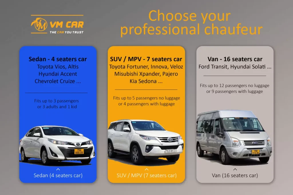 Rental cars with professional chauffeurs are a quality service of VM Travel. Helping thousands of travelers around the globe make great decisions when traveling to Viet Nam. Save money on rental cars by making a booking for car rental deals with us and getting a safe trip. We offer private transport service with an English-speaking driver. The door-to-door private service. Pick up on time and drop off at your hotel.